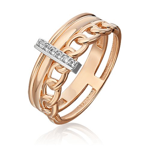 Широкое кольцо из красного и белого золота 585 пробы на двойной шинке с white-топазами от ювелирного бренда PLATINA. Дизайн украшения в стиле минимализм геометрия. Декоративная часть изделия выполнена с силуэтом цепи с крупными звеньями, соединённым с широкой золотой линией. Кольцо инкрустировано натуральными white-топазами, закрепка которых выполнена вручную.
