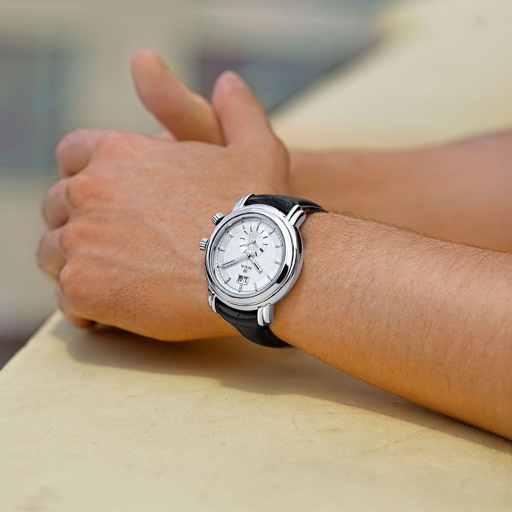 Второй часовой пояс этих часов по достоинству оценят деловые мужчины в частых командировках. Второй часовой пояс вынесен на отдельный циферблат. Метки в виде штрихов. Окошко даты находится в положении 12 часов. Заводная головка для второго часового пояса находится в положении 4 часа. Кожаный ремешок из натуральной кожи с раскладывающейся застежкой. Минеральное стекло с сапфировым покрытием, что способствует твердости и устойчивости к царапинам.