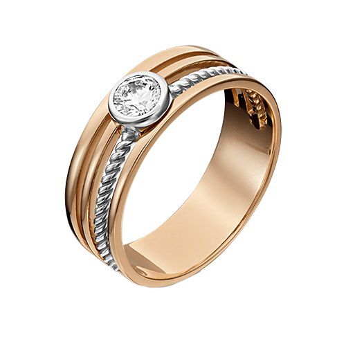 Стильное кольцо из красного и белого золота 585 пробы с фианитом. Дизайн украшения в стиле современная ювелирная классика, ампир. Верхняя часть шинки – сквозная, состоящая из четырёх полуколец, сходящихся к центральной вставке круглой огранки (одно из полуколец витое). Глухая закрепка камня смотрится стильно и гарантирует его сохранность и эффектный блеск.