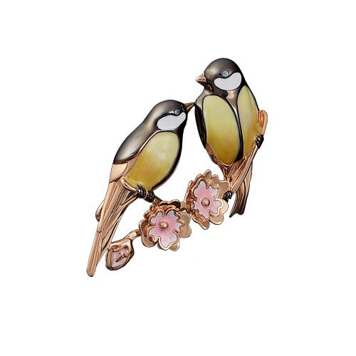 Объёмная брошь-синичка из красного золота 585 пробы. Дизайн украшения выполнен в стиле флора и фауна. Силуэт двух синиц символизирует оптимизм, радость и исполнение желаний. Изделие декорировано ювелирной эмалью (розовые лепестки цветков) и родиевыми вставками. Удобный и надёжный замок обеспечивает комфорт при длительном ношении.