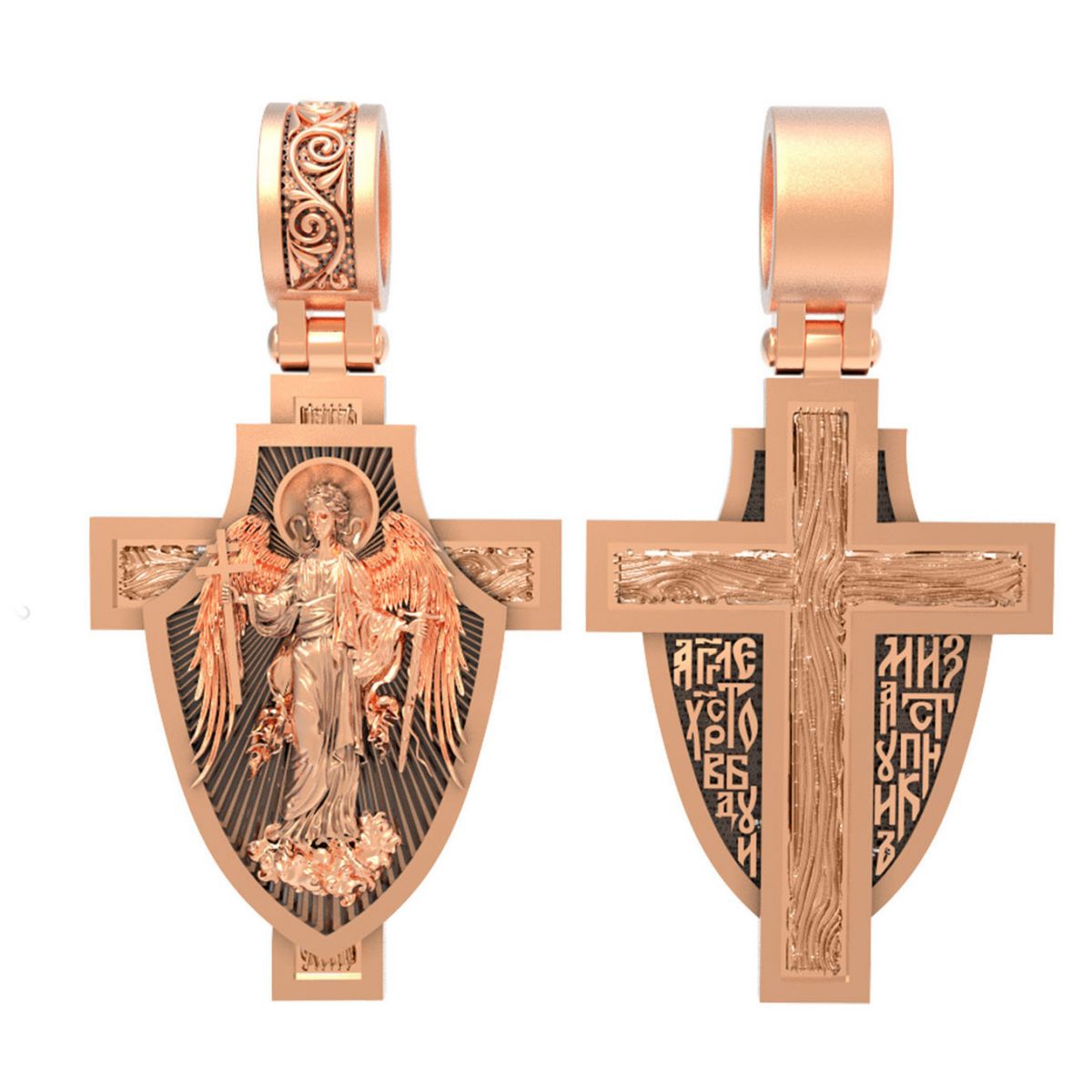 Основой композиции является изображение Святого Ангела-Хранителя держащего в правой руке крест, а в левой - мечь. Он изображен на фоне воинского щита. Крест является символом жертвенной любви всеблагого Бога к падшим людям, всепобеждающим духовным оружием христиан, основанием и средоточием церковной жизни. Ангел-Хранитель - это Ангел приставляемый Богом к человеку при крещении для охраны и помощи в добрых делах. Он невидимо находится при человеке на протяжении всей его жизни, если человек сохраняет в себе любовь к Богу и истинную веру перед Ним. Ангел-Xранитель делают для нас все, что служит к истинному нашему благу и спасению. Невидимо пребывая при нас постоянно, он, руководствуя нас ко спасению, не только по нашему желанию таинственно наставляет нас на все доброе и полезное, не только возносит наши молитвы к Богу, но еще и сам от себя охраняют и защищают нас от врагов видимых и невидимых и ходатайствует за нас пред Богом.