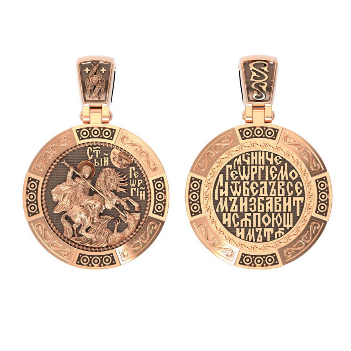На лицевой стороне изображен Святой Георгий Победоносец. Образ Великомученика считают одним из наиболее чтимых святынь в Святыни Православных, он олицетворяет собой заступника для верующих, чья жизнь имеет какое-либо отношение к военным делам, также он может оберегать и землевладельцев. Поскольку при жизни св. Георгий был военным, он считается покровителем всех, кто имеет отношение к армии — военнослужащим, участникам боевых действий. Молитва перед иконой Георгия Победоносца поможет защититься от врагов, одержать победу в сражении (военном, спортивном, духовной брани с дьяволом), содействие в установлении мира между членами семьи, избавиться от телесного недуга. На кулонном кольце изображен шестикрылый Серафим - самый приближенный к Господу Ангел.